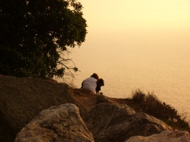 Story: This was taken by another photographer but with my camera, so it's MINE. It was dusk on the PCH (different trip from the pumpkins) and we had pulled over to get a shot of the sunset on the water. The photographer noticed these two individuals downhill a bit from the turnout. It is one of my favorite photographs due to its sense of urgency and lack of specificity. They seem to be lovers but they could be friends or siblings or relatives. The embrace seems like a lengthy consolation but, it could have been short and in jest. Who has hurt whom? Who is leaving whom?