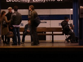 Story: If you take the B, D, F or V lines through Manhattan, you would have stopped at Broadway-Lafayette. Perhaps it was the Gallic name of the station which attracted Monsieur Accordéoniste who sits on the far right. I wish I had been able to record the sounds of the accordion swirling amidst the scent of exhaust and dried urine. Truly a Parisian combination. I was intrigued by the angles within the shot: the accordionist was facing completely to the right, the man on the bench forward and the group of conversationalists all towards each other. Each party had its own agenda and interest. I was sitting at the on the opposite side of the tracks and set my camera on my bench cum tripod. The shutter had to stay open quite a while to gather what little light was down there but I am quite pleased with how this turned out.